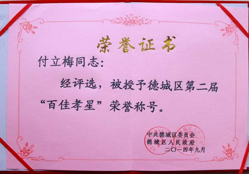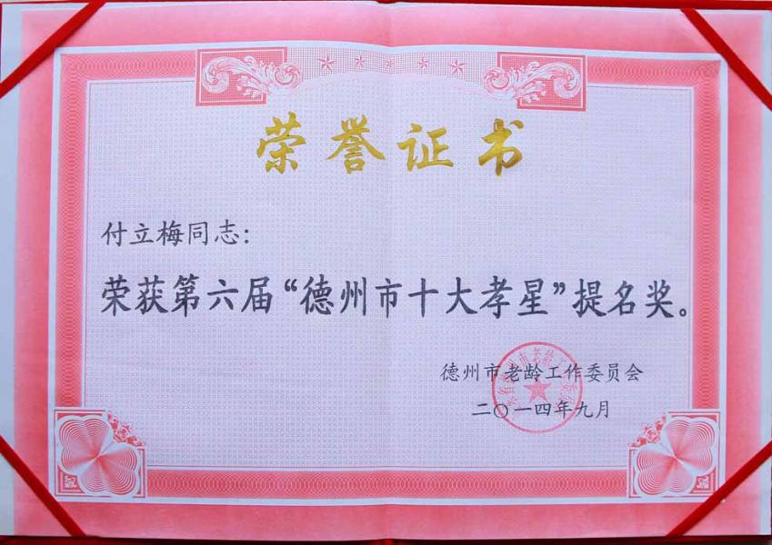 熱烈祝賀公司月嫂付立梅榮獲“德州市十大孝星”提名獎和“德城區百佳孝星”榮譽稱號